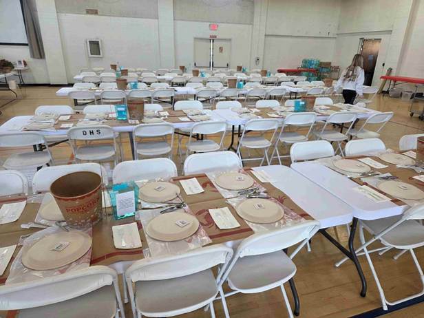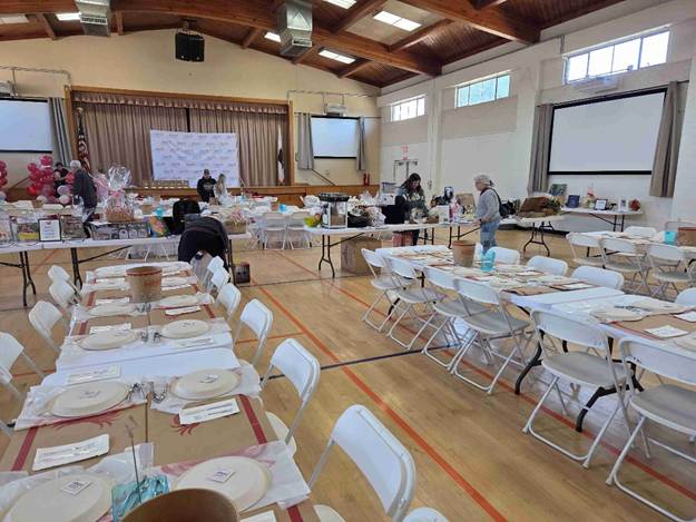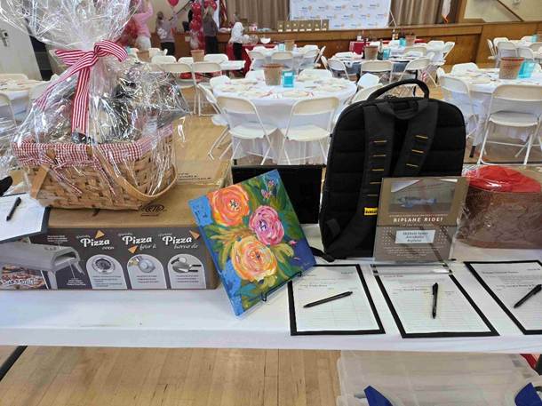 shrimp with a salad, pasta and dinner rolls. A lot of people were bidding on the silent auction and on the 7 cakes. A drawing was held