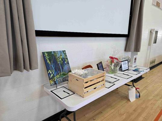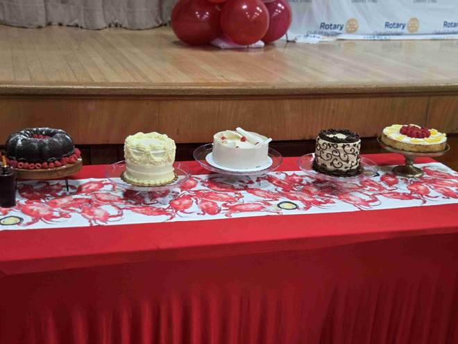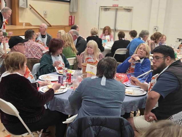 shrimp with a salad, pasta and dinner rolls. A lot of people were bidding on the silent auction and on the 7 cakes. A drawing was held